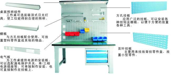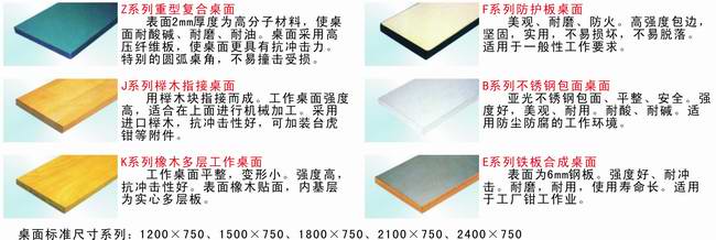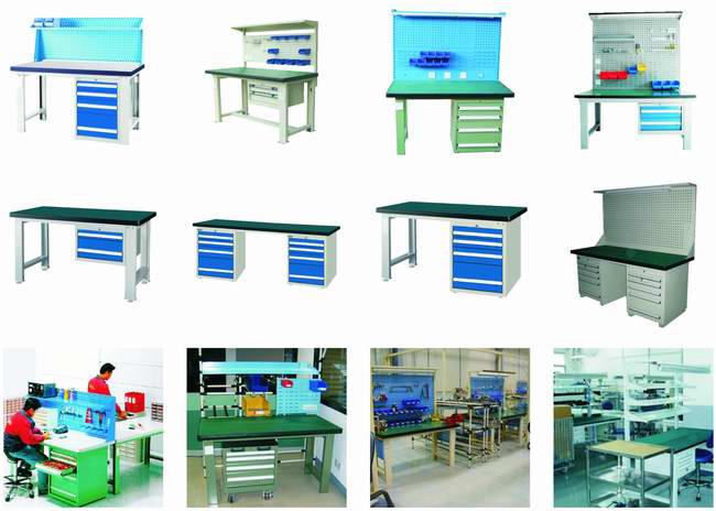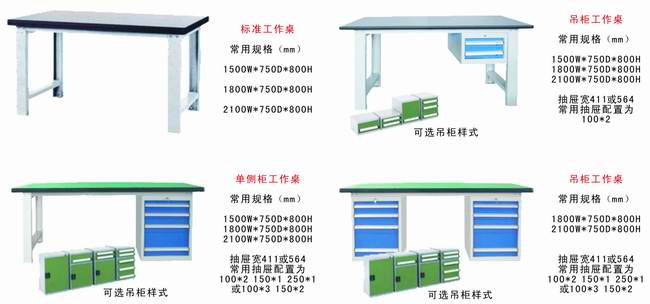 工作桌 作为各种作业的操作平台,工作桌可以根据客户的不同需求,在六种桌面材料中选择适合的材料 以适合客户需求。它适合于钳工、模具、装配、包装、检测、维修、车间办公等各种作业现场。模块化的设 计可以便捷的添加各种组件来满足使用需求。如百叶或方孔挂板、电源组件、照明组件等。 工作桌的选型首先要确定承重大小,以便我们为您选取适合的桌体结构;其次确定使用情况,以便我们 为您选取适合的桌面尺寸及材质;最后确定存取需求和作业用途,以便我们为您选取适合的桌上附件和桌下 吊柜或桌用工具柜的配置。